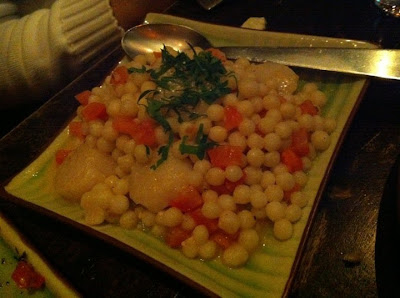 Scallops moghrabieh: tender scallops tossed in giant cous cous, shanklish (aged yoghurt cheese) & diced tomatoes