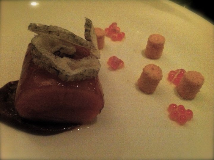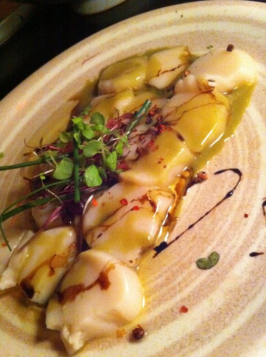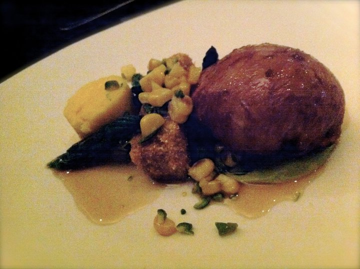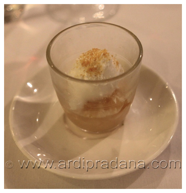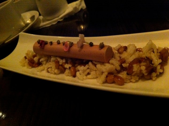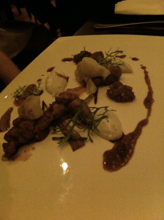 Our first course of the night was chilled sweet peas blended to perfect smoothness. It was a very nice and interesting way to start the special night. A refreshing taste combination between pureed pea soup and mint ice cream cleansed our palate before the first savoury dish.