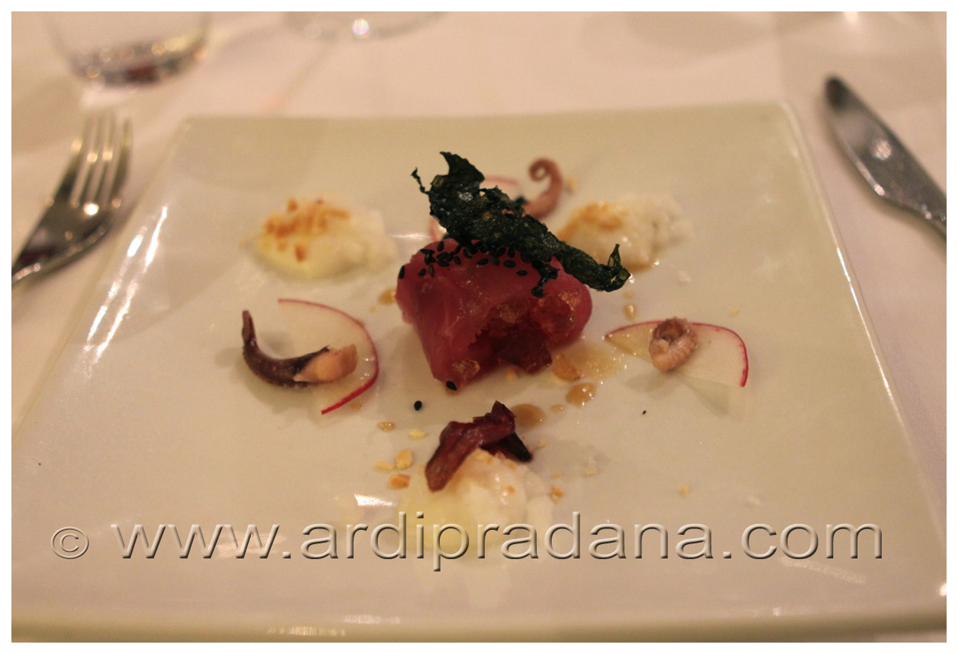 The third course was another simple dish of Tuna sashimi with a nice and sweet marinade and shishito pepper. As an Indonesian, I found it really weird to actually mention garlic chips on my dish since we normally put heaps on them in an Indonesian dish. Some leaves of garlic chips gave different texture and accentuation to this dish.