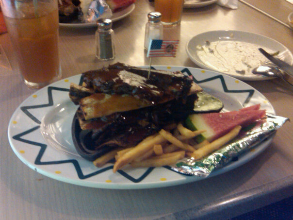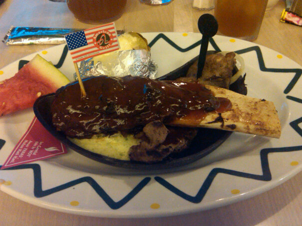 We had two main courses to try with and both of them had the same seasoning. One was Buntut Bakar (Grilled Oxtail). It came with the unique Melinjo crackers and vegetable soup. Again, not anyone will enjoy this kind of treat. The second one was a bit ‘neutral’, Iga Bakar BBQ (BBQ Ribs). Unfortunately, these are not those gigantic Sydney’s Hurricane’s ribs. Quite the opposite, they were pretty tiny. I think it’s fair enough, considering the very low price of it. They did come in a nice old-fashioned hot plate, with sides of fries and veggies + additional yummy BBQ sauce.