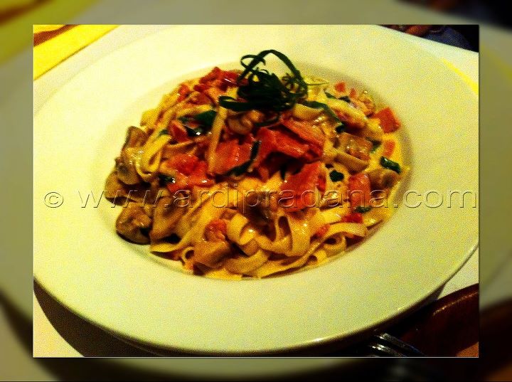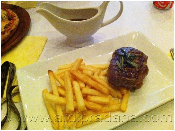 We were really surprised to learn that the pasta was mostly $12.50 a dish – and the dish was massive! We also thought that the calamari rings had a very nice tartar sauce, although the aioli was pretty salty. The pizza was too thick (although the waiter told us we could’ve ordered the thin one and it wasn’t on the menu) to my taste. We love the steak’s Dianne sauce, but unfortunately not the steak.