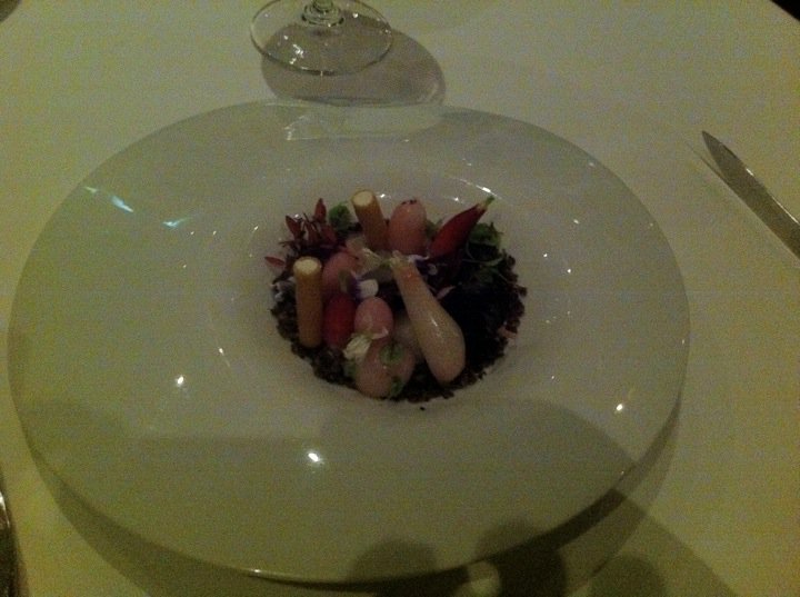 Salad of pink turnips & breakfast radishes, violets, olives, pine, resin, balsamico