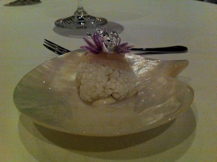 Gentle braise of pearl oyster, southern rock lobster, shaved squid, tapioca, lettuce heart, oyster cream, pea flowers
