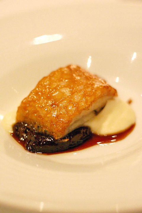 Braised Snapper Fillet (alt. Slow braised Berkshire pig jowl, maltose crackling, prunes, cauliflower cream, perfumed with prune kernel oil)