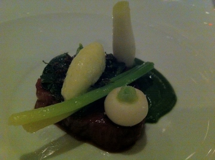 The second main course was also breathtaking. Lightly poached marbled wagyu fillet accompanied by soft Tasmanian wasabi tasted extremely chewable and juicy. The soft meat was complemented by nice green spinach and green peas puree. I was amazed by the softness of the meat.