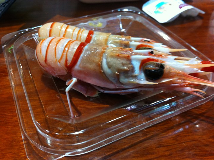One of the rare products sold in fish market is the Scampi. Technically, they are still crustacean and are actually more related to lobster than prawn. Size-wise, they are more of a shrimp, but they have a distinct sweet taste. One piece of Scampi Sushi is usually sold at a price of $4.5, but in this place you get 25 scampi for $15… It’s a really good bargain! I must admit that you must de-shell the Scampi yourself which is a bit of a challenge if you don’t have any scissors handy.